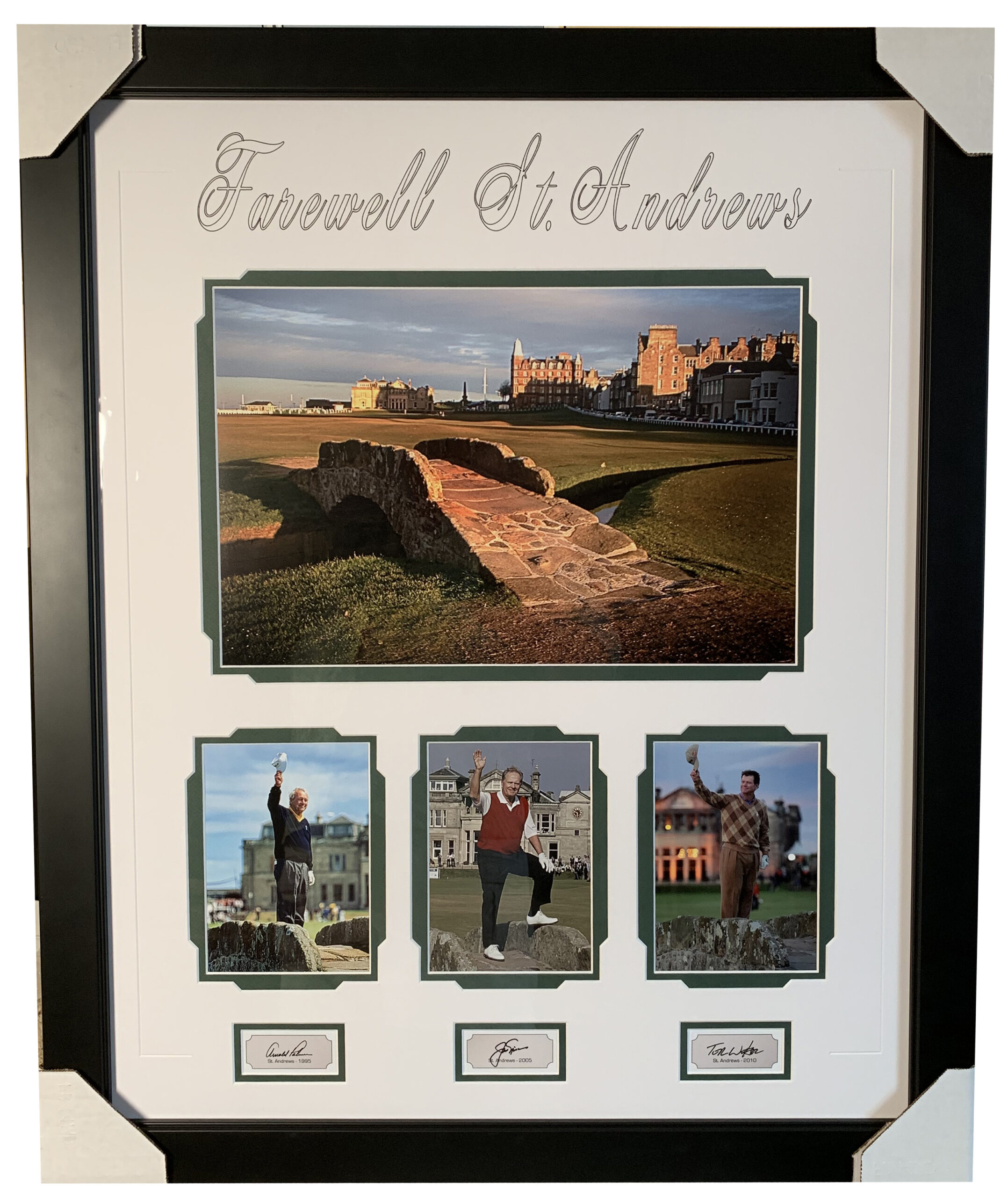 Golf’s biggest names shown waving good-bye from the Swilcan Bridge. Printed signatures and the year that each left the British Open included.